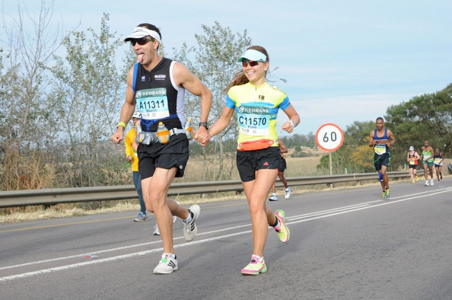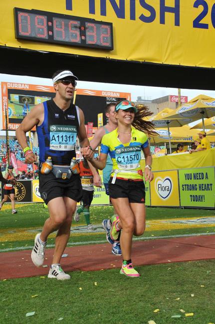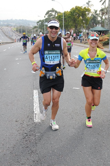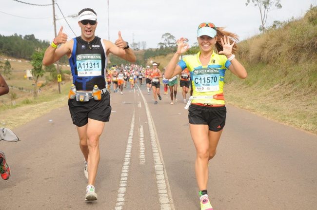 Перед очередным крутым подъемом, где-то на 40-м км, я остановилась в слезах и пыталась собраться. Мимо пробегала Marissa Louise Carstens, она остановилась, подошла ко мне, обняла и стала успокаивать, что это Комрадес, нужно терпеть, будет очень тяжело, но потом обязательно будет финиш и это ее 7-ой Comrades. На доли секунд мне стало еще тяжелее, эмоции не позволяли справиться с собой, но через минуту я уже бежала в горку и пыталась запомнить имя и номер человека, который помог мне в такой сложный момент. Мариссу мы нашли на Фейсбук и поблагодарили за помощь и ее вклад в мой первый Comrades. Дальше все как в бреду: мы стали останавливаться на пунктах помощи волонтерами, которые растирали мышцы льдом, охлаждали спреями. Я делила мысленно дистанцию на этапы - 30, 42, 50, 65, 75, 80…. Я ждала с нетерпением отсечки по чипу и думала о том, как много друзей и знакомых волнуются и видят как мне тяжело, но я не сдаюсь. Спустя время я все больше понимаю, какую бесценную поддержку мне оказал Максим. Он пытался общаться со мной, искал слова поддержки, хвалил, следил чтобы я питалась, обливал водой, нес на себе бутылки с водой, в некоторые горки мы вбегали держась за руки, что вызывало восторг у зрителей и у других бегунов. Кто-то говорил, чтобы он не торопился, кто-то предлагал помочь и другим девушкам, а некоторые шутили, что сейчас ей тяжело, а километре на 70-м увидишь, как откроется второе дыхание и попробуй догони. Говорят, что у женщин есть преимущество на ультра-марафонах - не верьте, это все сказки…