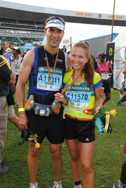 В крупнейшем и самом престижном горном марафоне "Comrades" собирается и спортивная беговая элита, и множество любителей со всего мира, около 15 тысяч человек выходит на старт и около 10-20% не успевают финишировать за 12 часов (лимит гонки). По статистике около 45% участников финиширует в промежутке с 11 до 12 часов. "Comrades" проводится по шоссе, один год вверх - из г.Дурбан на побережье Индийского океана в горы, а на следующий год - вниз, из г.Питермарицбург в Дурбан. Забег вверх короче, обычно 85-86 км. В этом году был забег вниз, он составляет 89.700 метров (фактически у меня garmin насчитал 90.3 км). Девятикратным победителем The Comrades является Брюс Фордайс, который установил рекорд Африки на 100 км, но самая главная наша гордость в том, что рекордсмен гонки в обе стороны Леонид Швецов (2007 и 2008 гг.), среди женщин – многократные победительницы Comrades - Олеся и Елена Нургалиевы.